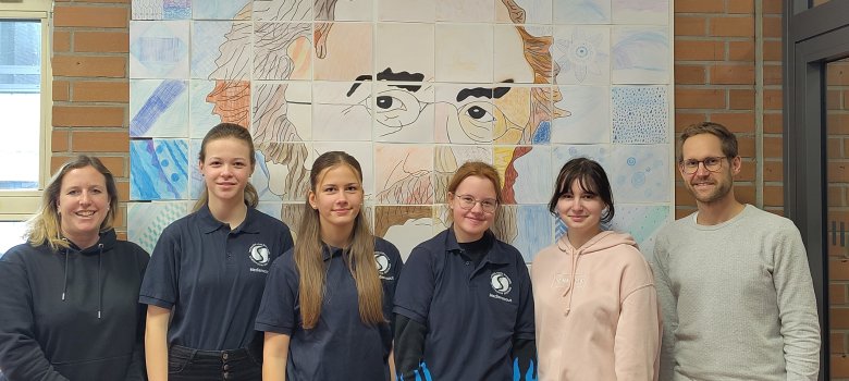 Г-жа Вестерман, нашите медийни скаути Стела, Мара, Хелън и Ема и г-н Шапман (от ляво на дясно)