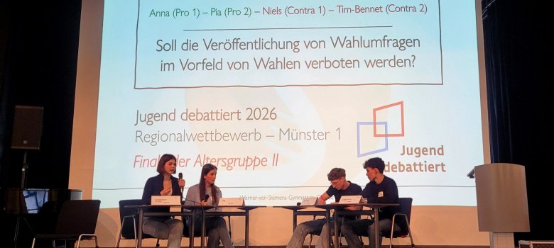 A zenei megnyitó és a hat münsteri és münsterlandi iskolából érkezett vendégek köszöntése után az I. korcsoport (8-10. osztály) 16 vitázója és a II. korcsoport (felső tagozat) 12 vitázója több selejtezőkörben világos álláspontokkal, megalapozott érvekkel és tisztességes, tiszteletteljes interakcióval nyűgözte le a résztvevőket.
